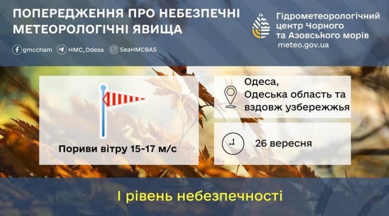 Вдень 26 вересня очікуються пориви північно-східного вітру 15–17 м/с.