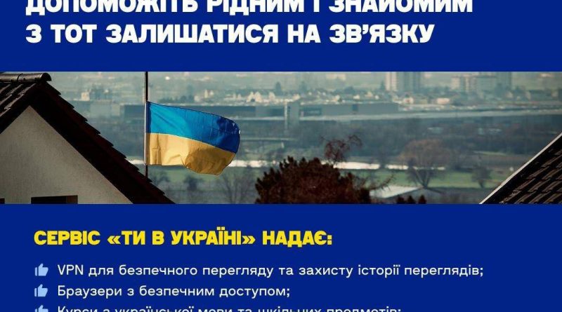 Розкажіть своїм знайомим чи рідним із ТОТ, що для них працює платформа «Ти в Україні». Сервіс допомагає кожному, хто на ТОТ: підключити безкоштовний VPN, що рятує від стеження і допомагає читати новини з України; отримати браузер, щоб безпечно користуватись інтернетом; безкоштовно вивчати українську мову – незалежно від віку; знайти корисні поради для себе; бути на зв’язку з Україною. Цей ресурс став «вікном в Україну» для людей, які живуть під контролем окупантів Маєте знайомих і родичів в окупації — передайте їм це посилання: https://tyvukraini.com/ Сайт почав роботу в 2024 році. Його запустили рух спротиву «Жовта Стрічка» спільно з проєктом Dovidka.info ДУ «Центр стратегічних комунікацій та інформаційної безпеки». Кампанія «Розкажи» закликає українців передавати посилання на платформу своїм рідним і знайомим на ТОТ. Один меседж може допомогти людині захистити себе онлайн і відчути, що Україна про неї пам’ятає Долучайтеся до кампанії «Розкажи» — будьте голосом України для тих, хто тимчасово не може його[…Читати далі…]
