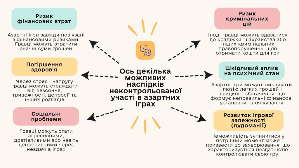 Важливо розуміти, що азартні ігри несуть із собою певні ризики. Гра може перетворитися на проблему, якщо постійно ризикувати великими сумами та багато часу витрачати на неї. Залежність від азартних ігор може мати серйозні фізичні, психологічні та соціальні наслідки.