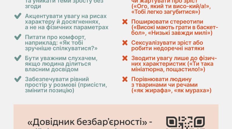 Про коректну комунікацію, зокрема з людьми, які значно вищі чи нижчі за середній зріст, розповідає «Довідник безбар’єрності» https://bf.in.ua/…/liudy-iaki-znachno-vyshchi-abo…. Ось кілька порад від фахівців. Обережно робіть компліменти. Наче позитивні вислови на кшталт «Ти такий високий, це так круто» чи «Ти така мініатюрна, пощастило» можуть мати зворотний ефект – викликати у людини відчуття, що її оцінюють лише за зовнішністю. Краще відзначити риси характеру, навички, внесок у спільну справу. Не акцентуйте увагу на відмінностях. Люди зі значно більшим або меншим за середній зростом можуть відчувати незручності в транспорті, громадських місцях чи під час вибору одягу. Тому жарти чи коментарі про зріст часто звучать образливо або виснажливо для співрозмовника. Подбайте про фізичний комфорт під час взаємодії. Коли ви спілкуєтеся стоячи, варто подумати, як зробити розмову зручною для обох. Це може бути зміна позиції (наприклад, присісти поруч із низькою людиною), вибір іншого місця чи просто уточнення: «Як тобі буде краще спілкуватися?». Уникайте стереотипів і узагальнень.[…Читати далі…]