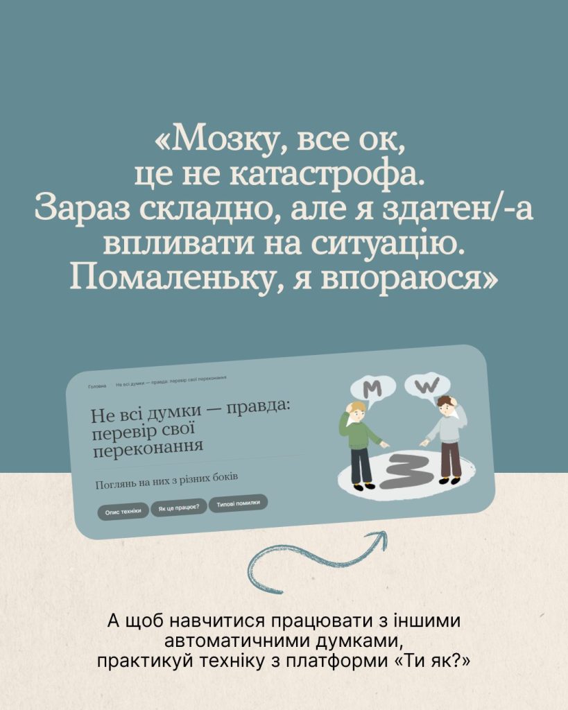 Дізнайся, як можна працювати з думками, щоб зберегти ресурси на розв’язання проблем, а не хвилювання. Шукай техніку «Не всі думки — правда» на платформі «Ти як?»
