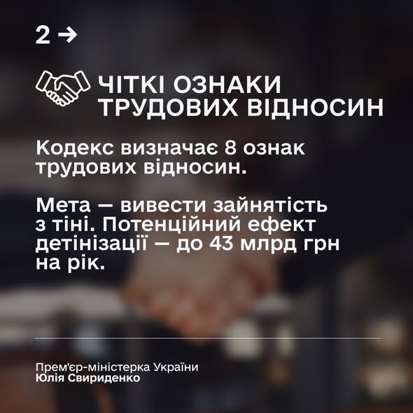 Кодекс закріплює чіткі ознаки трудових відносин. Документ визначає 8 ознак трудових відносин. Це допоможе зменшити правову невизначеність та вивести зайнятість з тіні. Попередні оцінки щодо детінізації ринку праці – 43 млрд грн на рік.