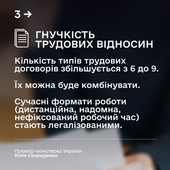 Гнучкі трудові договори. Кількість типів трудових договорів збільшується з 6 до 9. Кодекс чітко врегульовує сучасні формати роботи: дистанційна, надомна, нефіксований робочий час. Крім того, працівник зможе укладати з роботодавцем кілька типів трудових договорів.