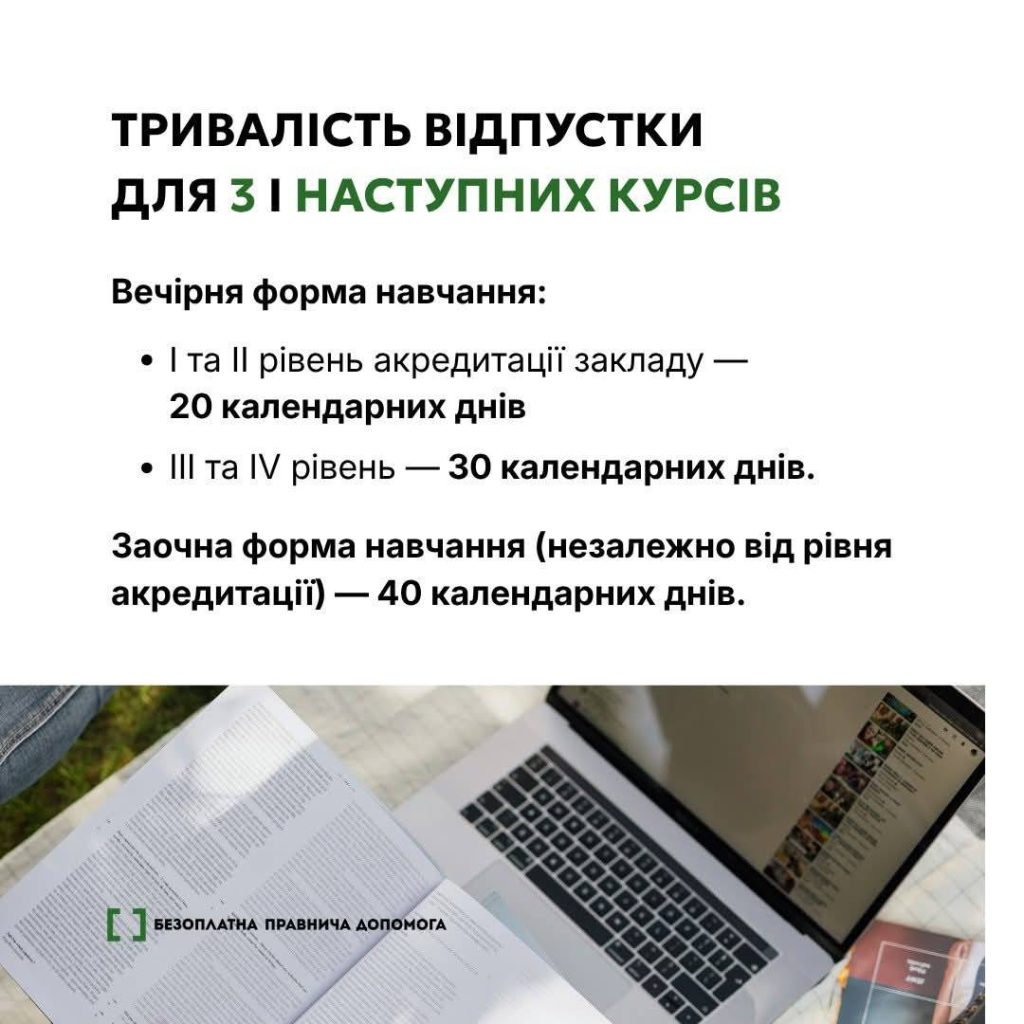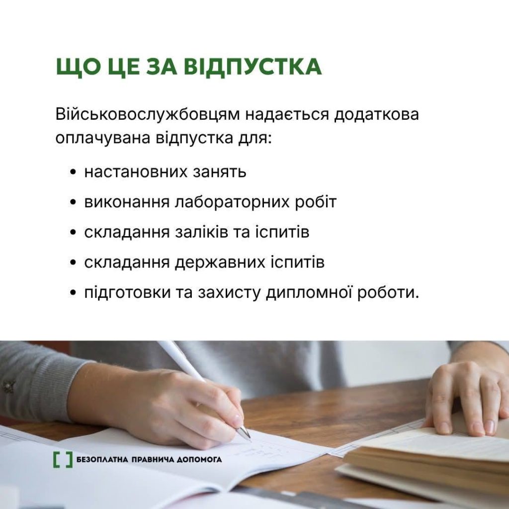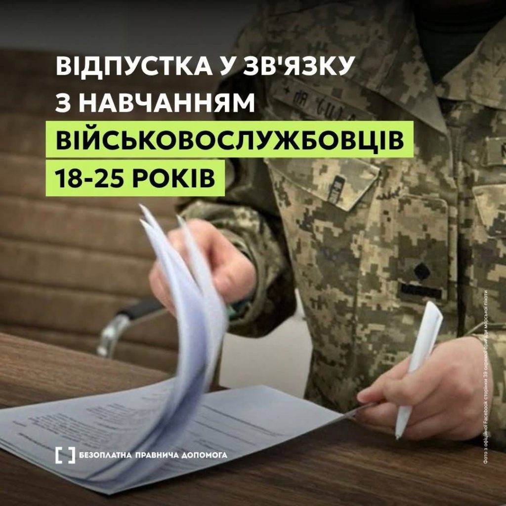 Для військовослужбовців віком від 18 до 25 років, які не мають вищої освіти та навчаються у закладах вищої або фахової передвищої освіти, передбачена відпустка у зв’язку з навчанням.
