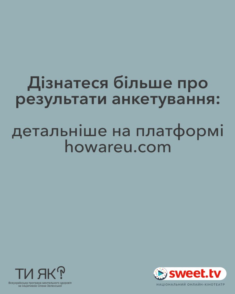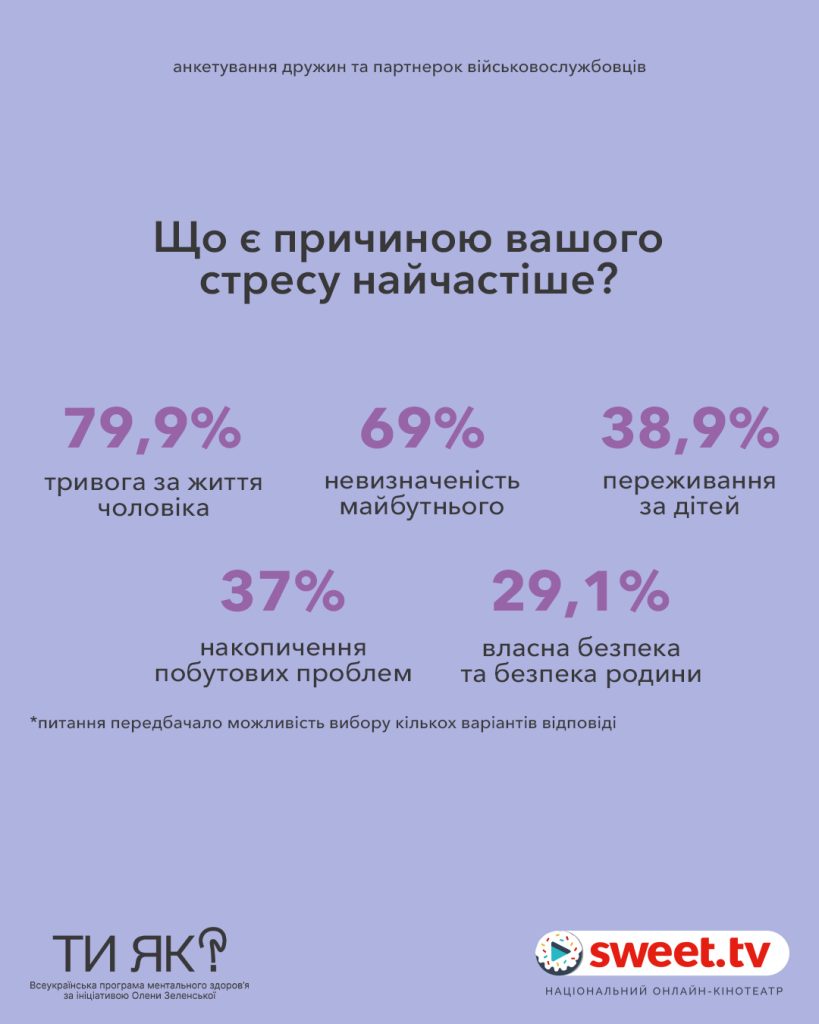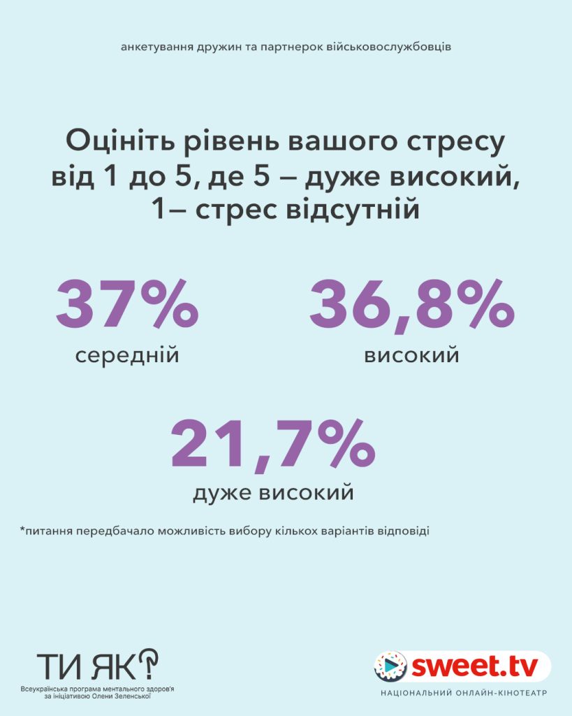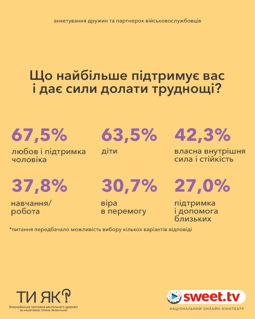 Національний онлайн-кінотеатр SWEET.TV за підтримки Всеукраїнської програми ментального здоров’я «Ти як?» — ініціативи першої леді Олена Зеленська — провів анкетування серед дружин і партнерок військовослужбовців. Його результати — у каруселі