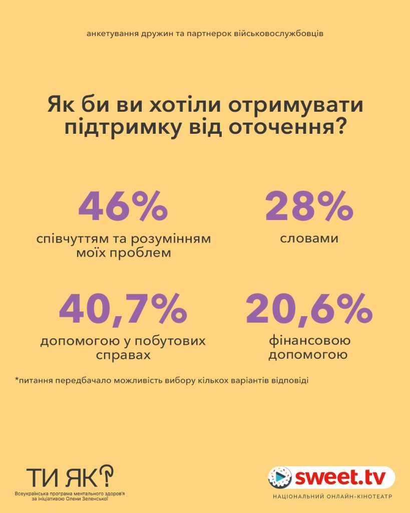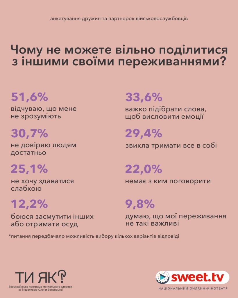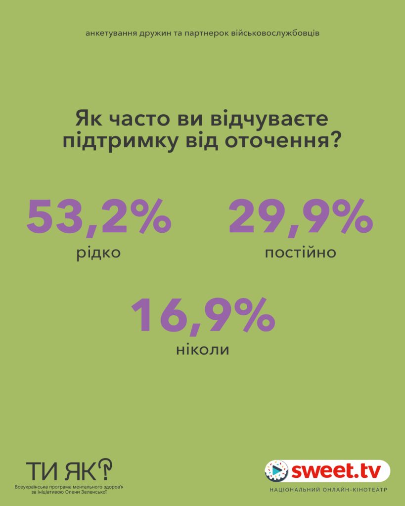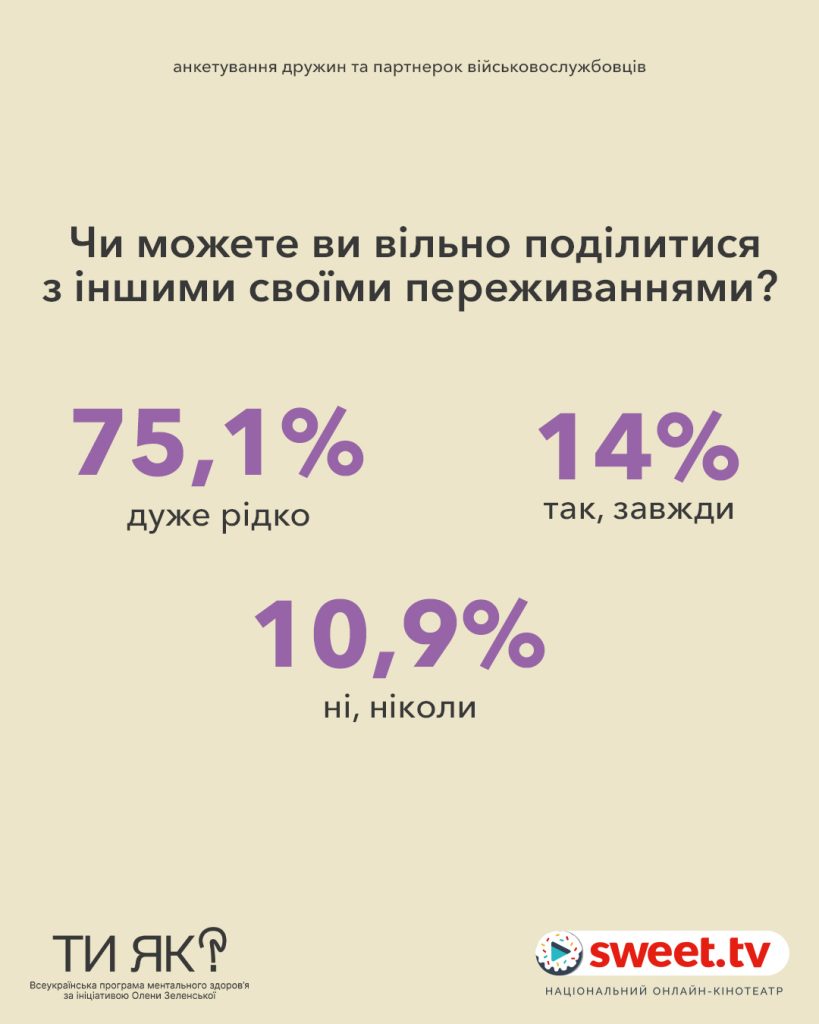 Національний онлайн-кінотеатр SWEET.TV за підтримки Всеукраїнської програми ментального здоров’я «Ти як?» — ініціативи першої леді Олена Зеленська — провів анкетування серед дружин і партнерок військовослужбовців. Його результати — у каруселі