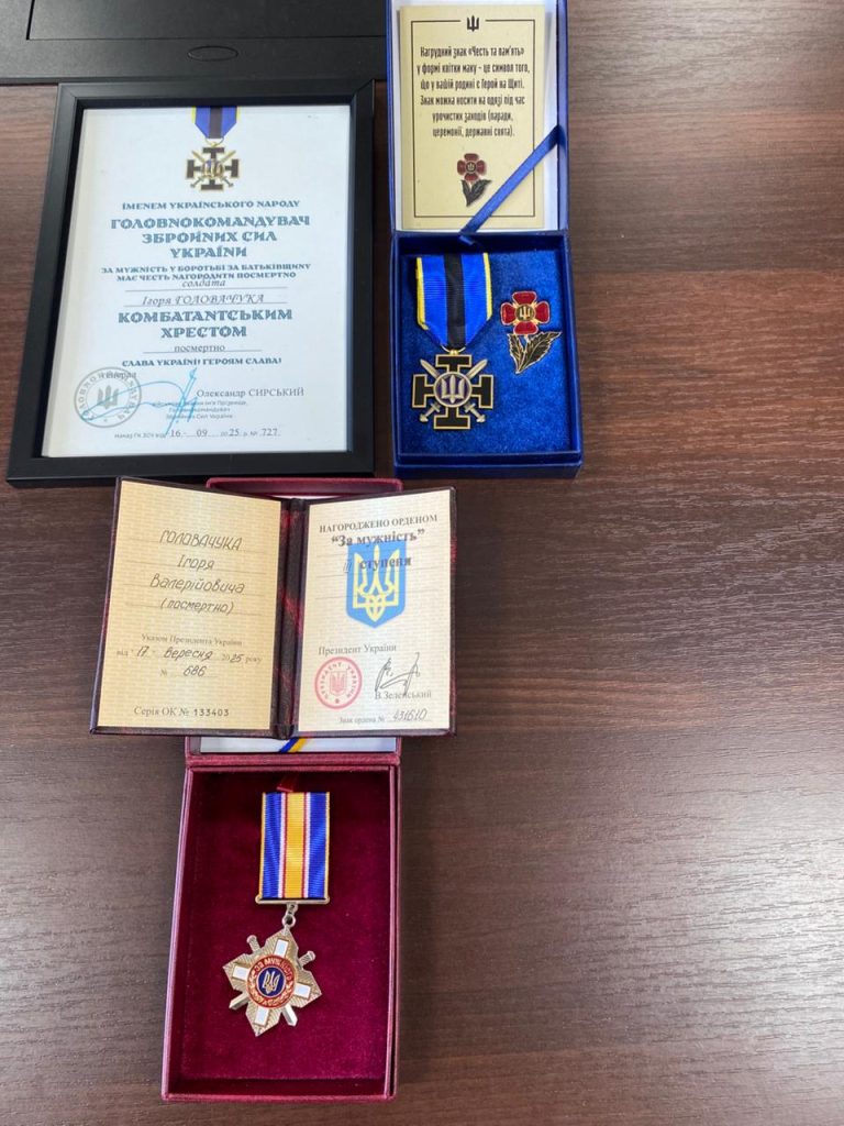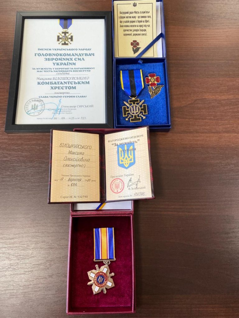 Указом Президента України від 17.09.2025 №686 за значний особистий внесок в оборону країни під час повномасштабної агресії рф, самовіддане виконання військового обов’язку при захисті державного суверенітету та територіальної цілісності України, орденами “За мужність” ІІІ ступеня посмертно нагородженісолдат БІЛОШКУРСЬКИЙ Максим Олексійович та солдат ГОЛОВАЧУК Ігор Валерійович. Також, згідно Наказу Головнокомандувача ЗСУ від 16.09.2025 №727 солдати БІЛОШКУРСЬКИЙ Максим Олексійович та ГОЛОВАЧУК Ігор Валерійович за виявлену мужність у боротьбі за Батьківщину посмертно нагородженіКОМБАТАНТСЬКИМИ ХРЕСТАМИ.