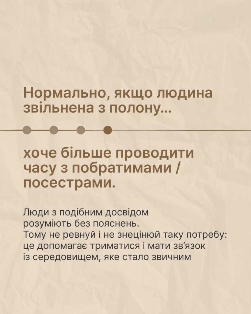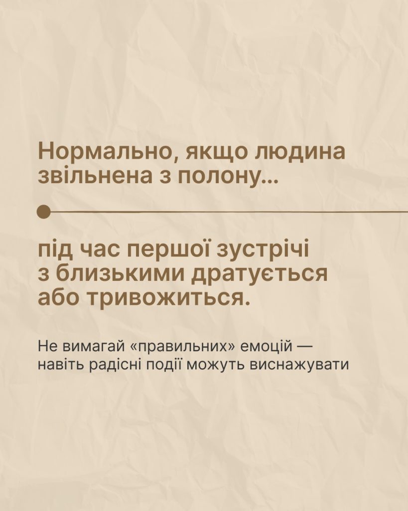 Перша зустріч рідних та захисника чи захисниці, звільнених з полону, може бути дуже емоційною. А повернення до звичного життя — повільним та потребувати простору і поваги до вибору та реакцій.