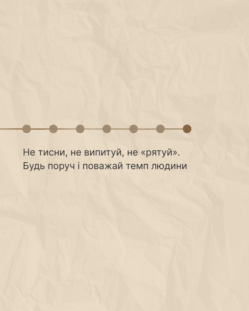 Починай із прийняття реакцій та емоцій людини, щоб підтримати її та не нашкодити. І залишайся поруч: говори, мовчи, обіймай чи тримай дистанцію. Та орієнтуйся на темп і побажання людини.