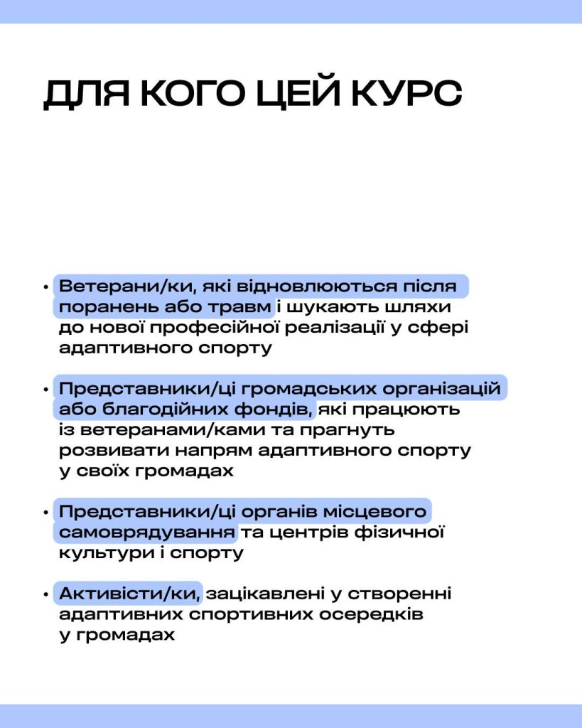 Представники/ці громадських організацій або благодійних фондів, які працюють із ветеранами/ками та прагнуть розвивати напрям адаптивного спорту у своїх громадах