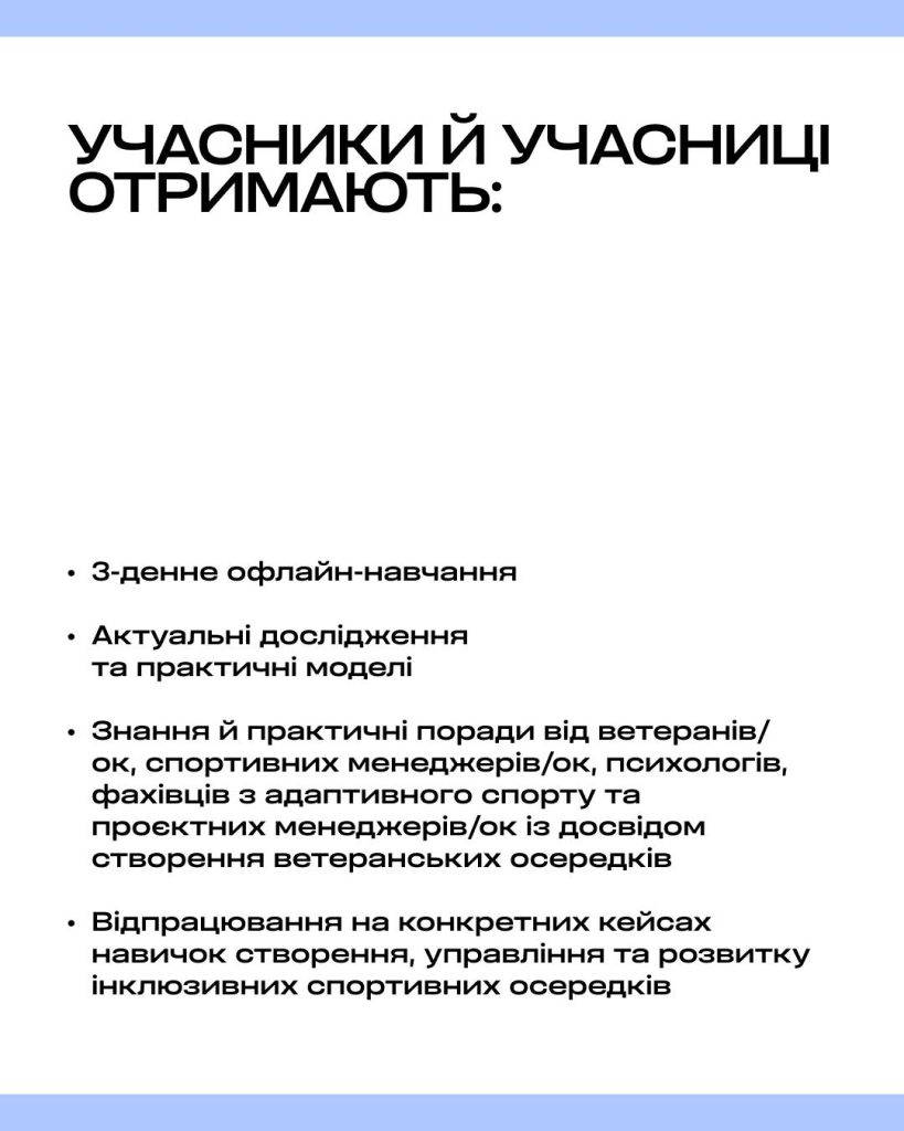 Знання й практичні поради від ветеранів/ок, спортивних менеджерів/ок, психологів, фахівців з адаптивного спорту та проєктних менеджерів/ок із досвідом створення ветеранських осередків