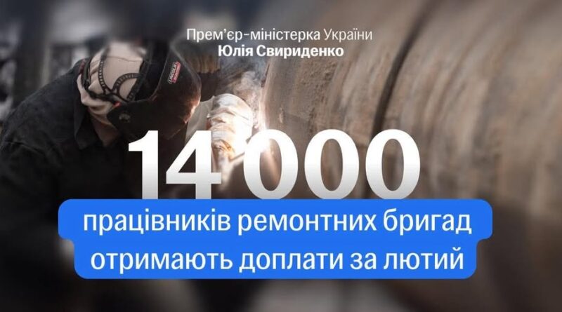 Понад 14 000 працівників ремонтно-відновлювальних бригад отримають доплати за лютий. Кошти будуть перераховані енергетикам, комунальникам, газовикам та залізничникам. Доплата становить 20 тисяч гривень.