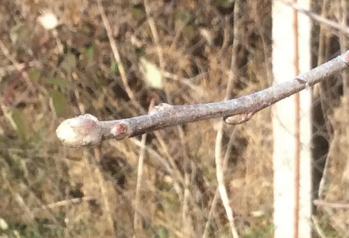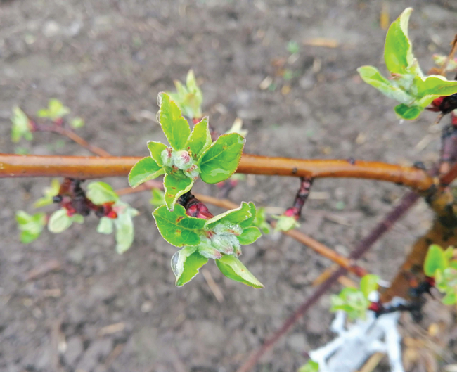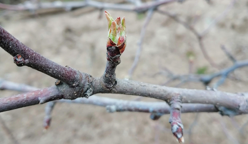 Фаза початок розпускання бруньок («мишині вушка»). Оптимальна фаза для захисту від кучерявості листя персика.