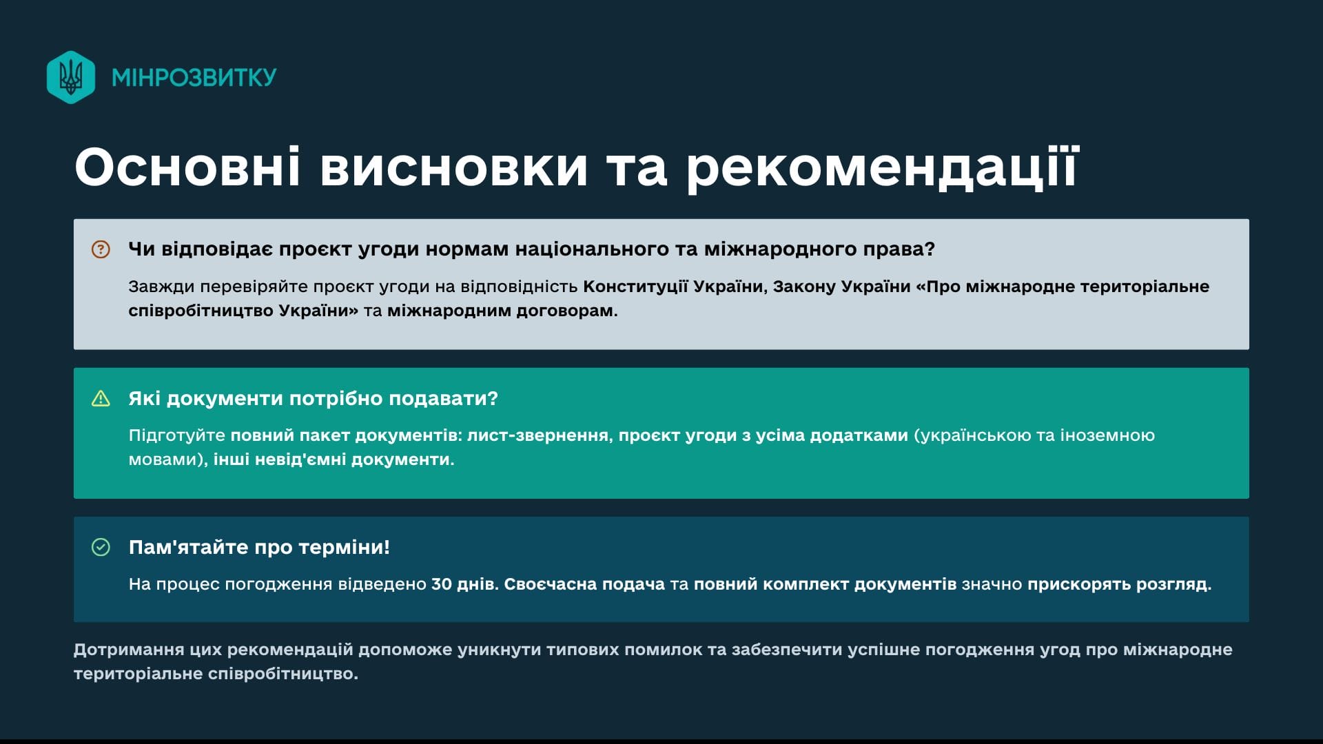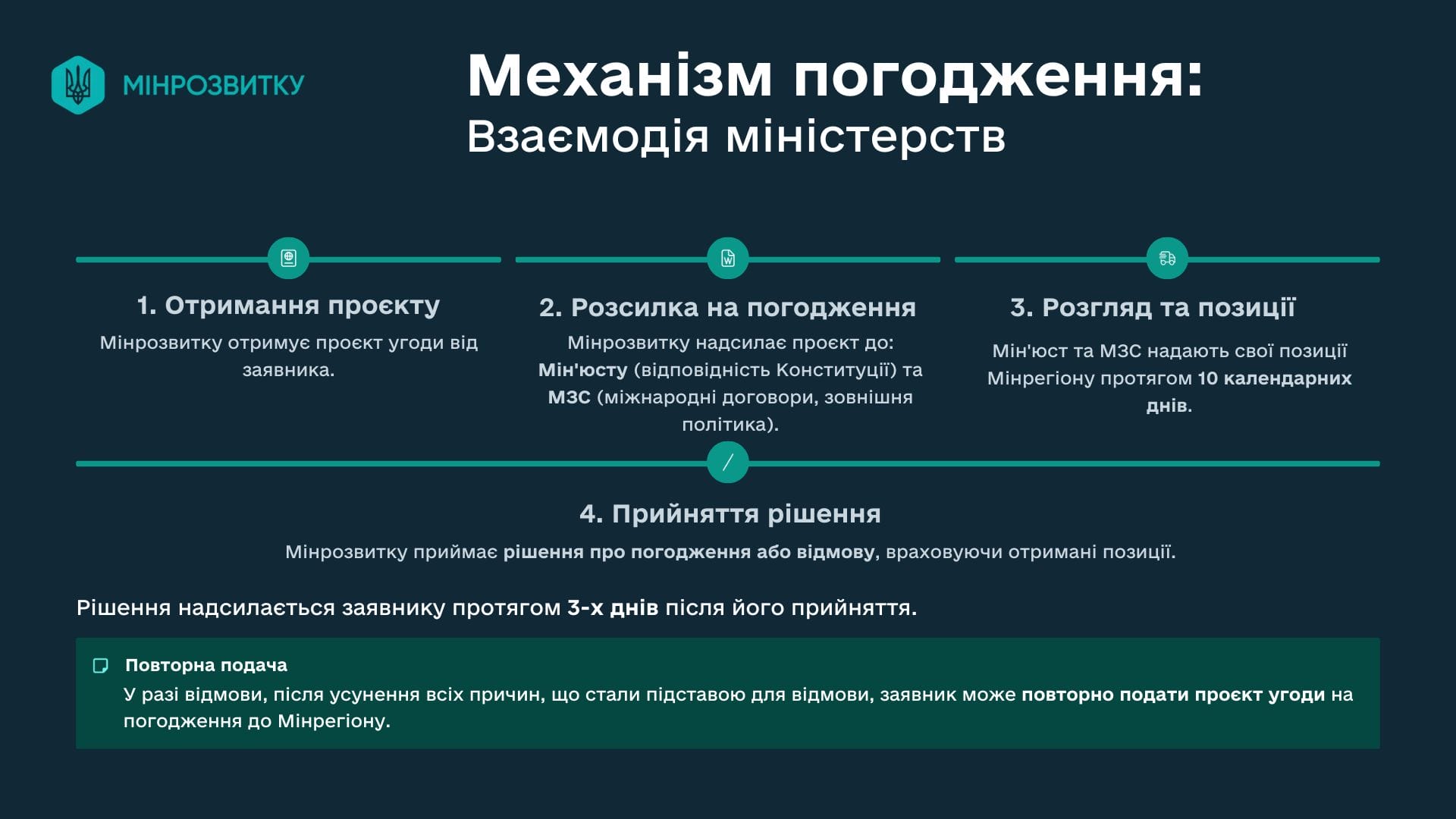 — Загальний строк погодження становить 30 днів. Міністерство юстиції перевіряє на угоди Конституції України протягом 10 днів, Міністерство закордонних справ — відповідність міжнародним договорам та зовнішньополітичному курсу України у ті ж строки. Мінрозвитку здійснює перевірку на відповідність Закону України “Про міжнародне територіальне співробітництво України”.