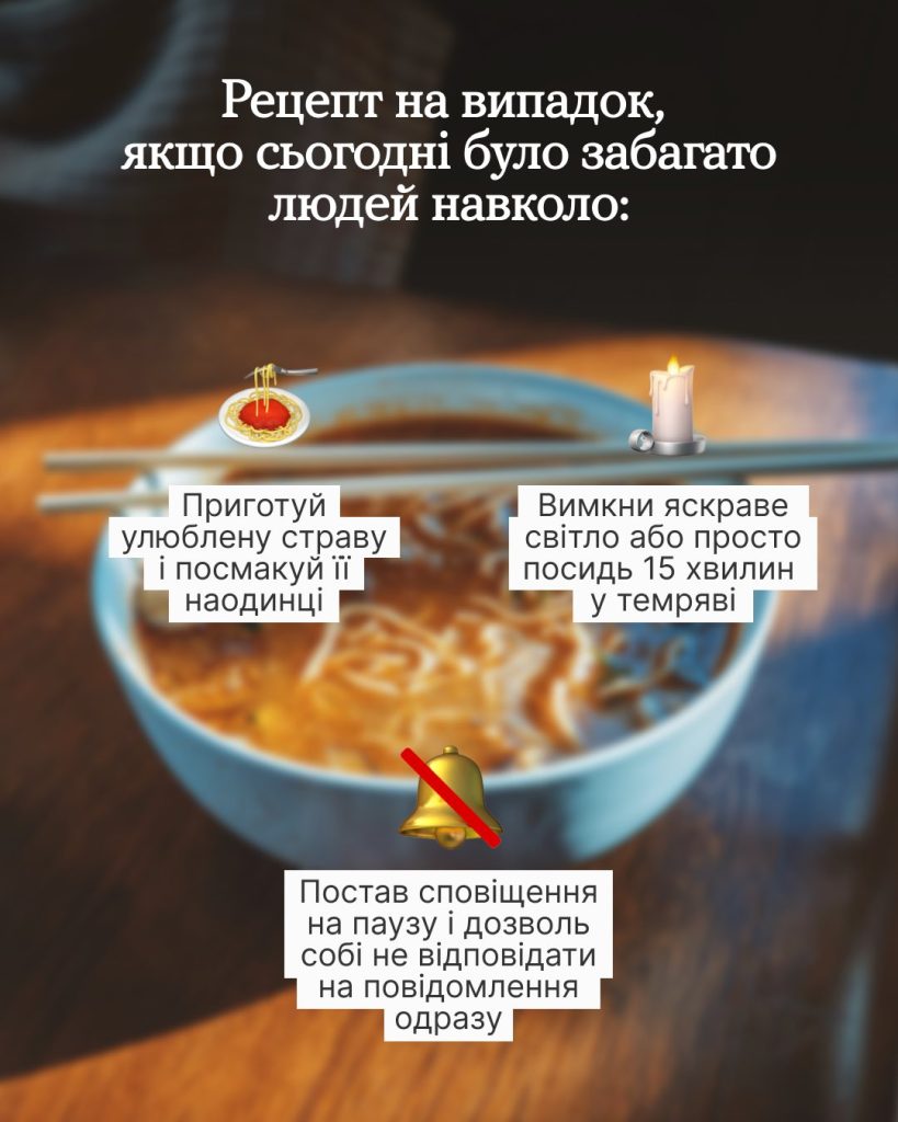 Якщо весь день пройшов за комп’ютером та спілкуванням з людьми, а вечір за гортанням стрічки соцмереж, твій мозок продовжує роботу на високих обертах, просто тепер обробляючи вже іншу інформацію. Тоді як насправді йому потрібна тиша та спокій від контенту.