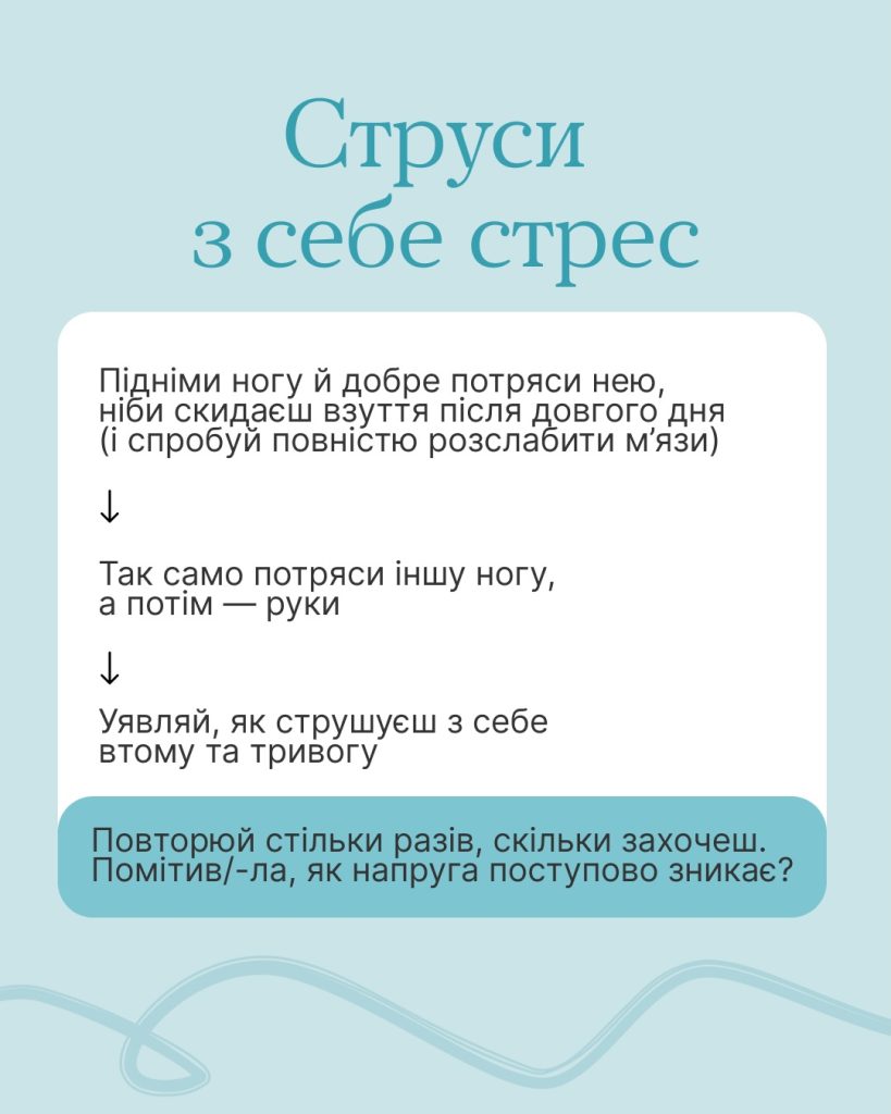 Стрес проявляє себе по-різному: тривожними думками, втомою чи фізичним дискомфортом — коли паморочиться в голові, бракує повітря, стискає щелепу чи плечі підіймаються до вух.