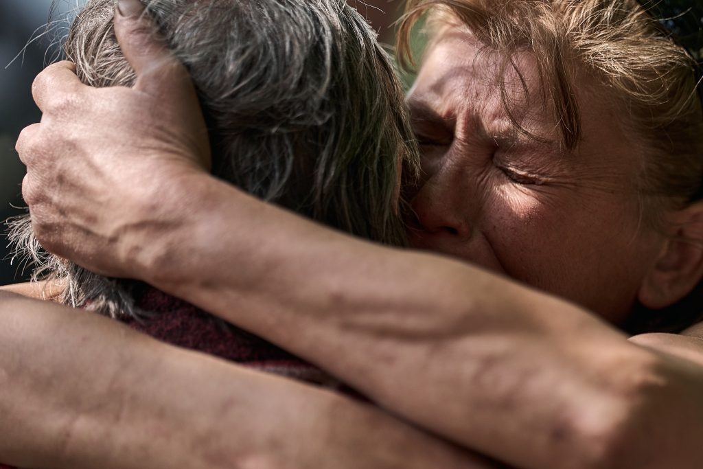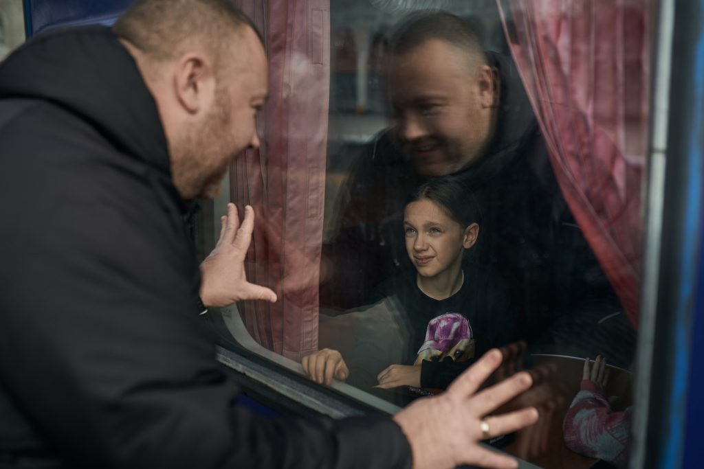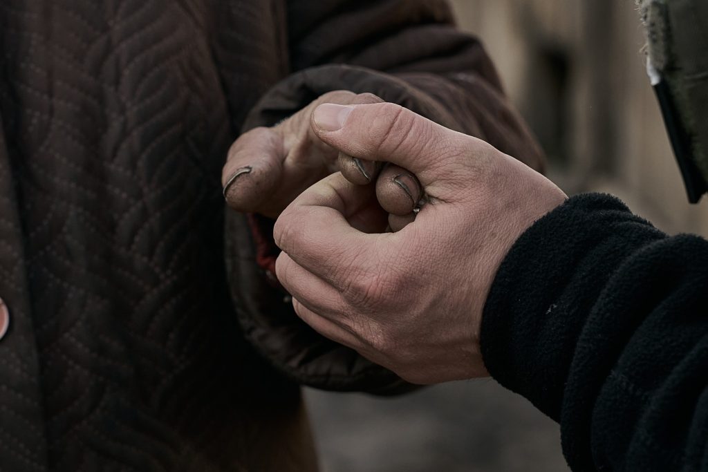 Капелан, який щодня займається евакуацією цивільних із зони бойових дій, тримає за руку жінку старшого віку, вмовляючи поїхати з Покровська. У цих кількох секундах – турбота, що теж виражається дотиком.