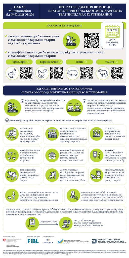 За підтримки Швейцарії, в межах швейцарсько-української програми «Розвиток торгівлі з вищою доданою вартістю в органічному та молочному секторах України» (Quality FOOD Trade Program), що впроваджується Дослідним інститутом органічного сільського господарства (FiBL, Швейцарія) у партнерстві з SAFOSO AG (Швейцарія), Міністерством економіки, довкілля та сільського господарства України та Держпродспоживслужбою, створено інфографіку, в якій вказані загальні вимоги до благополуччя сільськогосподарських тварин під час їх утримання.
