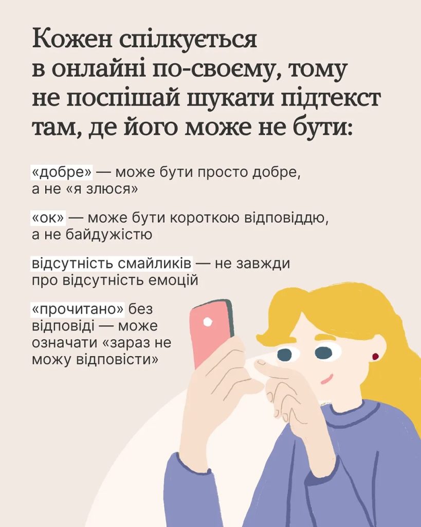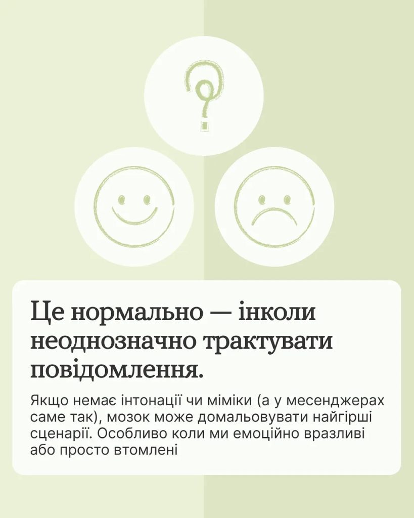 Але не варто одразу сприймати цю думку за правду. Наш розум любить заповнювати прогалини, особливо коли не чує інтонації, не бачить міміки та не знає всього про настрій іншої людини.