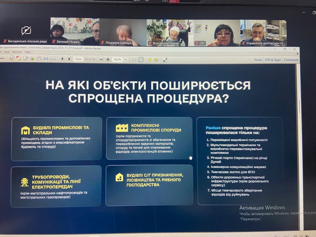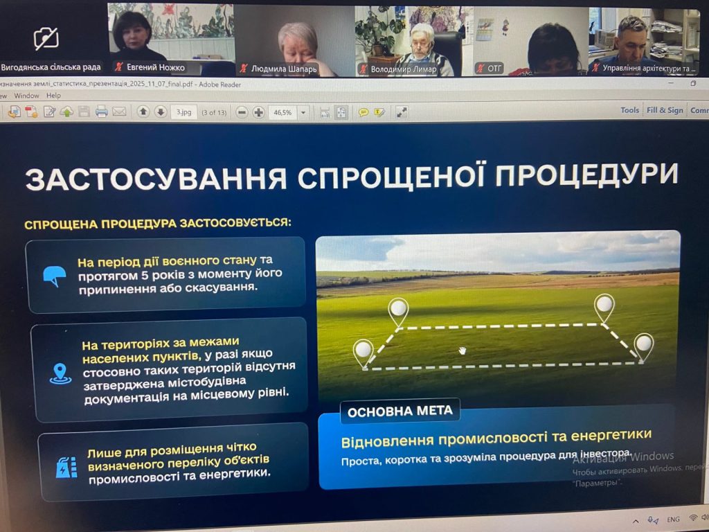 В ході онлайн-зустрічі розкриті основні цілі та способи досягнення мети розширення існуючої спрощеної процедури зміни цільового призначення землі, переваги застосування спрощеної процедури та як саме працюватиме спрощена процедура (на додачу до вже існуючої), на які об’єкти поширюється спрощена процедура та озвучені позитивні висновки про зміну цільового призначення земельної ділянки за спрощеною процедурою станом на ІІІ квартал 2025 року.